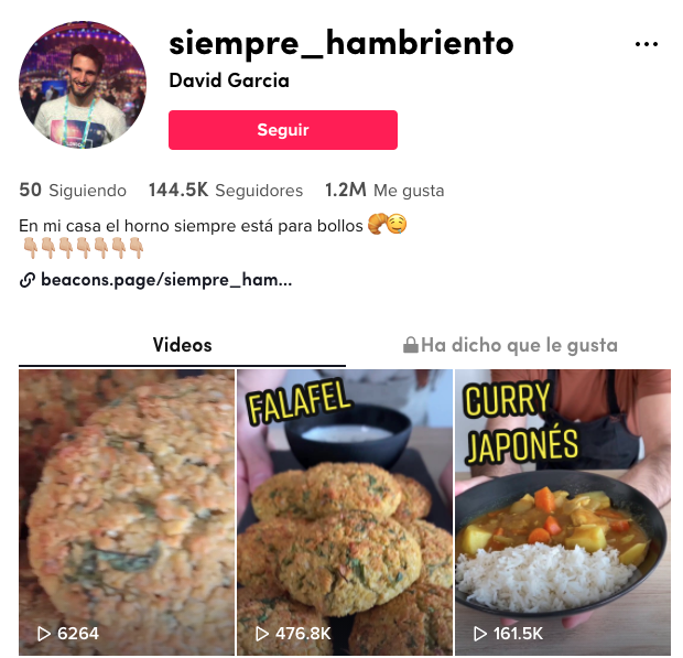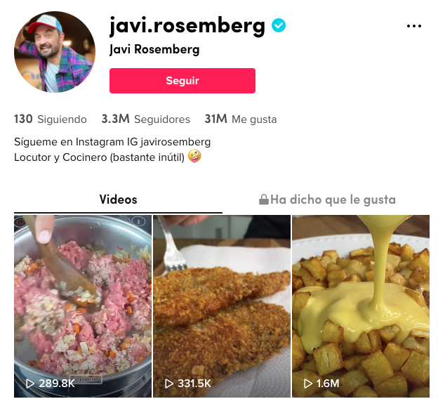El protagonista asegura que en su casa «el horno siempre está para bollos» y presume de 144,5K seguidores y 1,2M me gusta. Sus especialidades son las recetas rápidas, aportando ideas para aquellos que llegan a casa después del trabajo y no saben qué hacer con lo que tienen en la heladera.